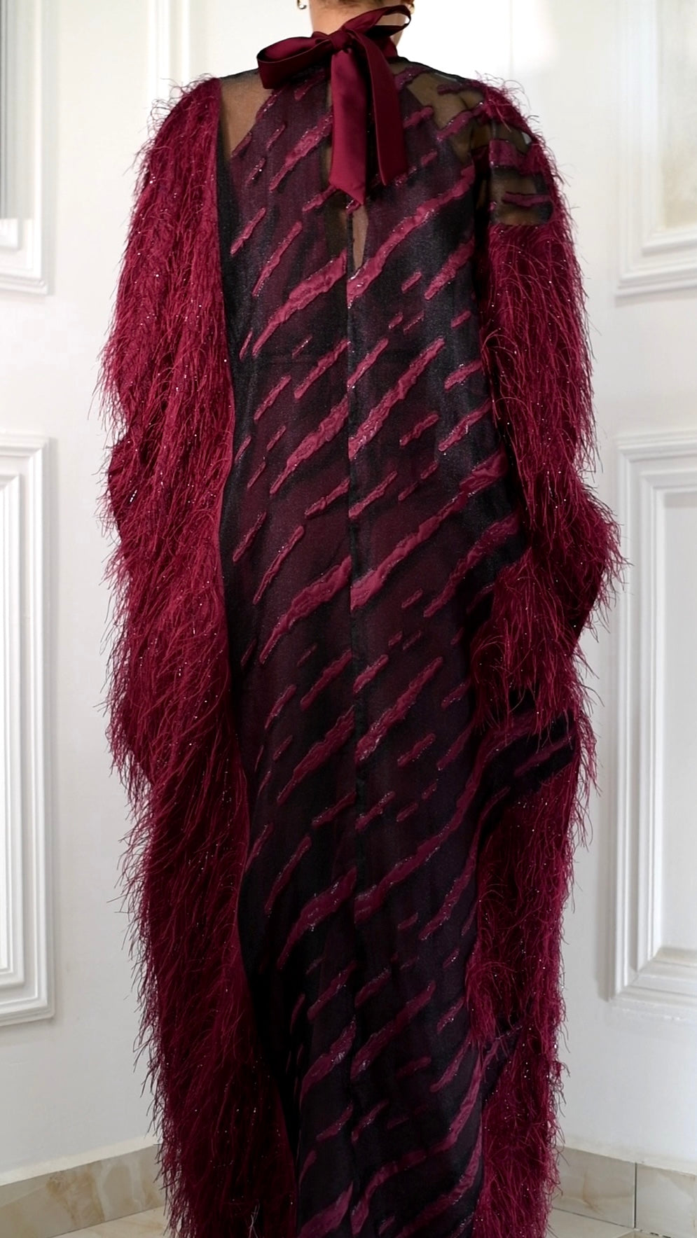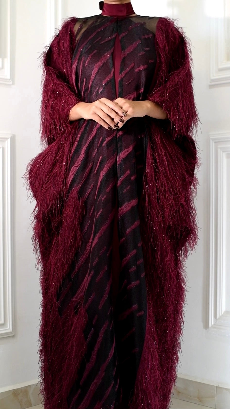 A true statement in dimension and depth. Scarlet blends feather-like textured fibers with sheer organza brocade, creating rich movement and tonal variation. Finished with a front hook-and-eye closure at the neckline, it elevates any look with effortless luxury.